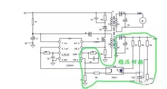 - 對(duì)UC3844單獨(dú)上電,短接PC2輸入側(cè),若電路起振,說明故障在PC2輸入側(cè)外圍電路;電路不起振則檢查輸出側(cè)電路。