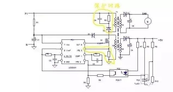 3、保護(hù)回路:PC1芯片本身和3腳外圍元件R4構(gòu)成過電流保護(hù)回路;N1繞組上并聯(lián)的D2,R6,C4元件構(gòu)成了開關(guān)管的反壓吸收保護(hù)電路;實(shí)質(zhì)上穩(wěn)壓回路的電壓反饋信號(hào)——穩(wěn)壓信號(hào),也可看作一路電壓保護(hù)信號(hào),但保護(hù)電路的內(nèi)容并不僅是局限于保護(hù)電路本身,保護(hù)電路的啟控往往是由于負(fù)載電路異常所引起的。