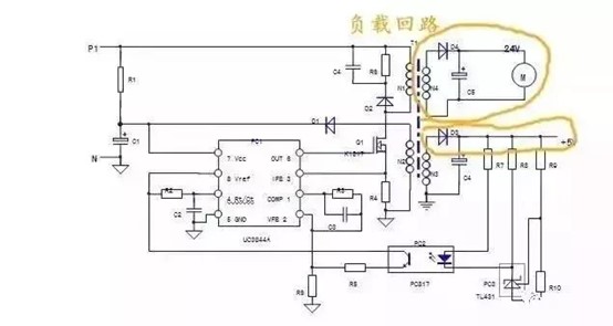 4、負(fù)載回路:N3,N4二次繞組及后續(xù)電路,均為負(fù)載回路,負(fù)載回路的異常,會(huì)牽涉到保護(hù)回路和穩(wěn)壓回路,使兩個(gè)回路做出相應(yīng)的保護(hù)和調(diào)整動(dòng)作。